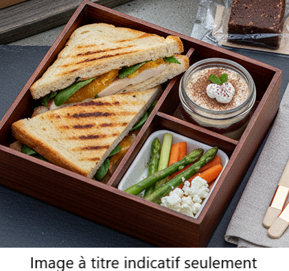 Faites impression avec La Raffinée. Cette boîte à lunch met de l'avant des pains artisanaux (Ciabatta, Focaccia, Croissant) et des ingrédients fins. C'est la solution toute désignée pour un comité de direction ou un invité spécial.